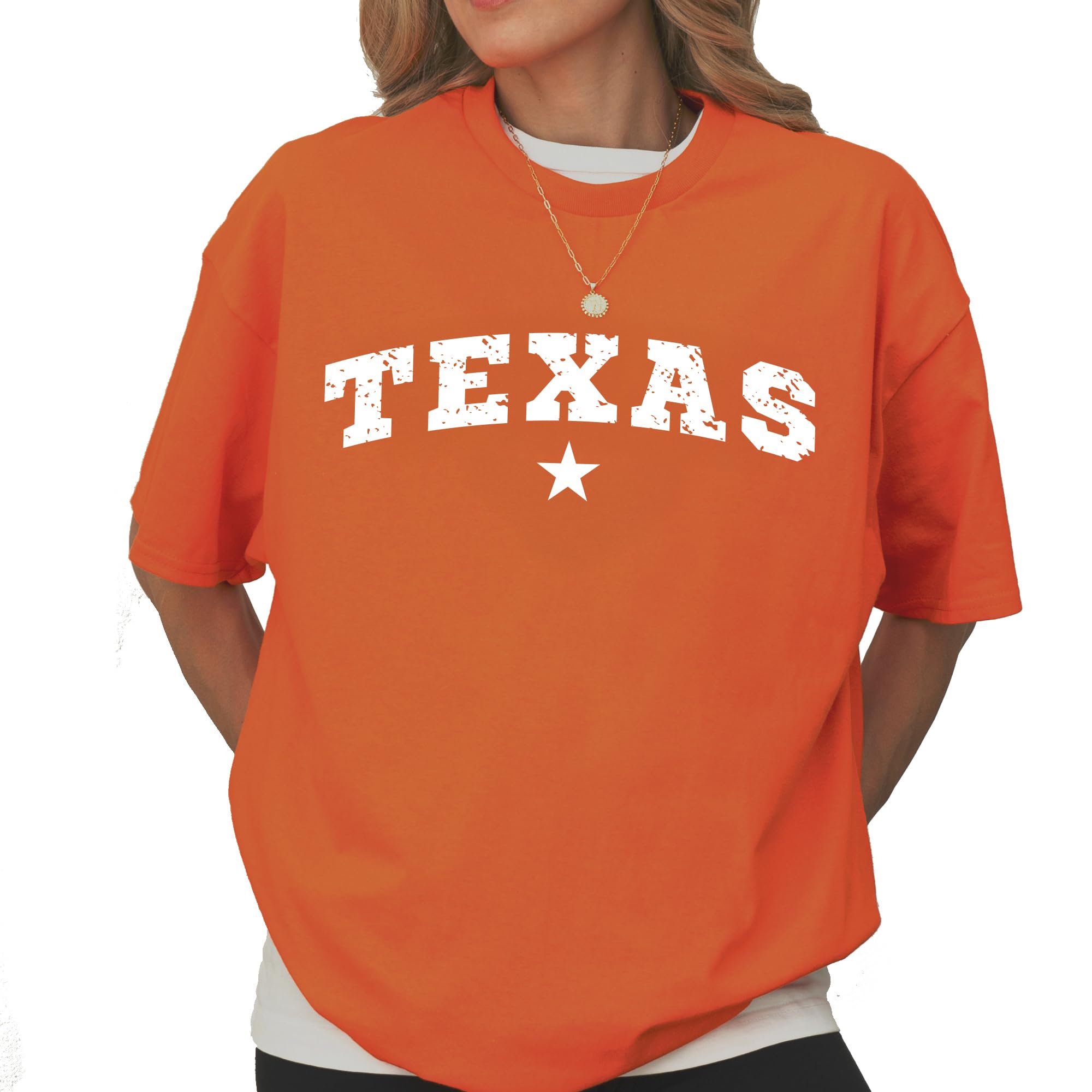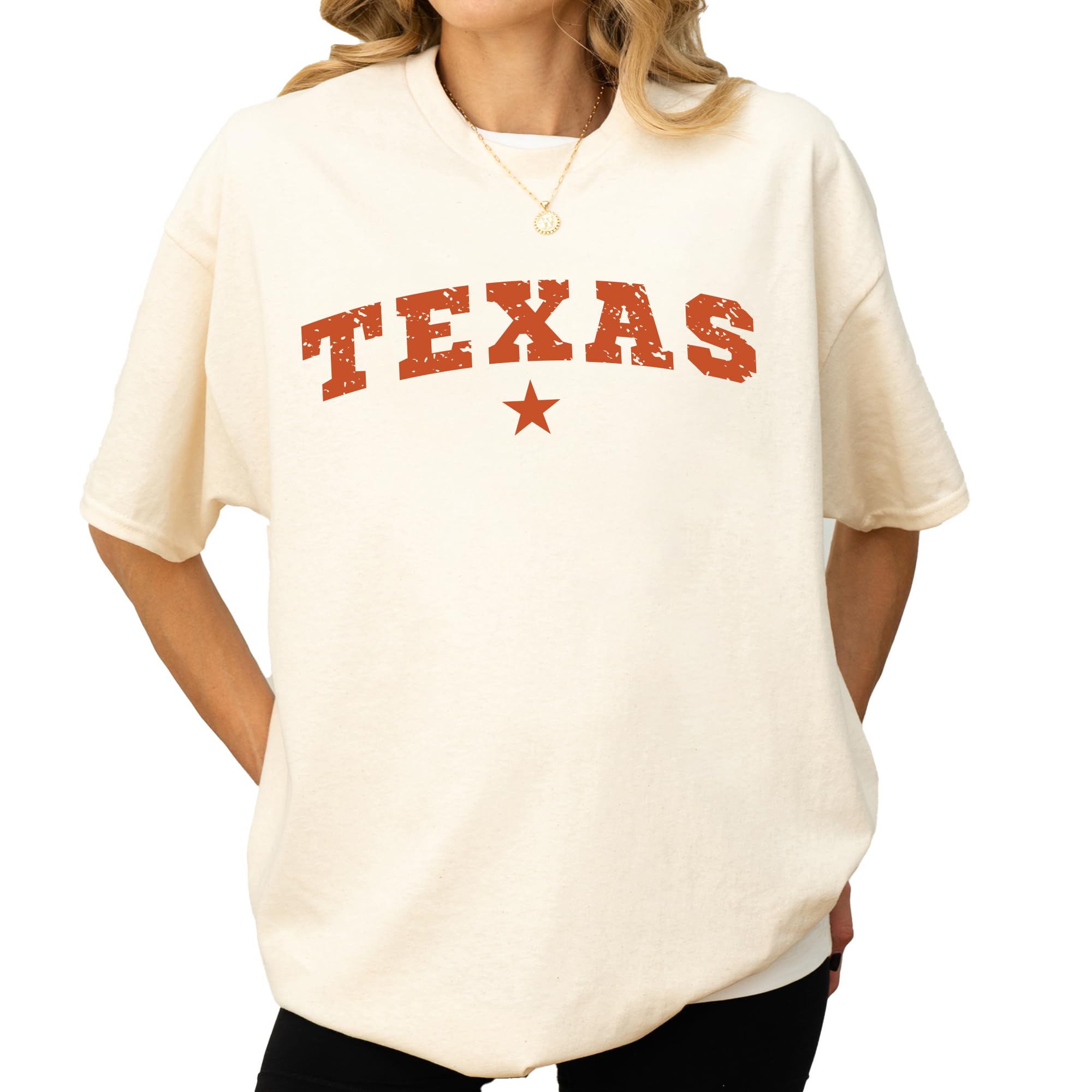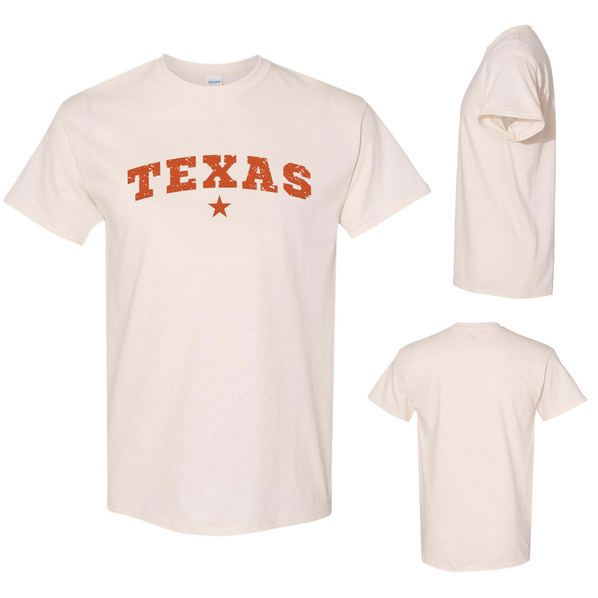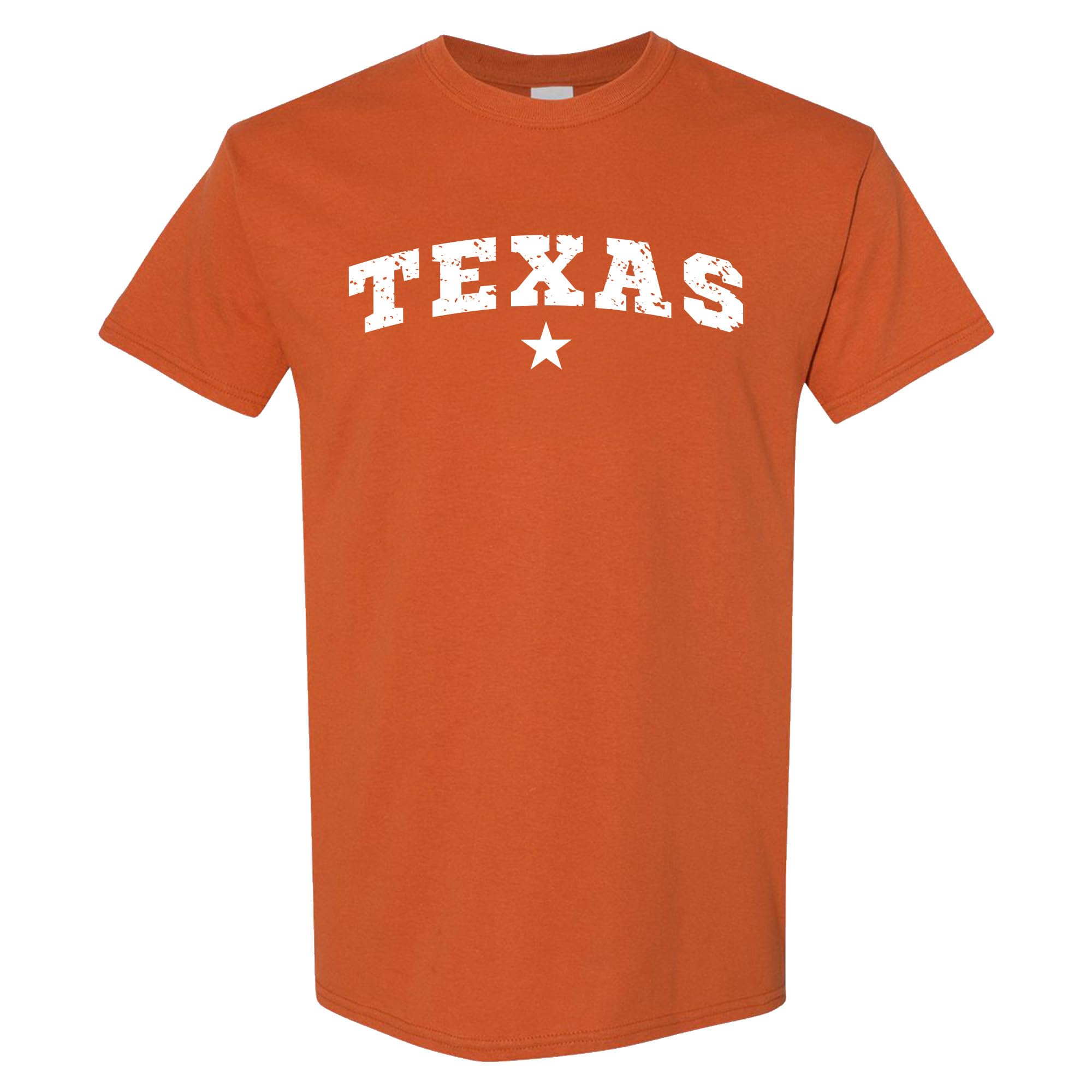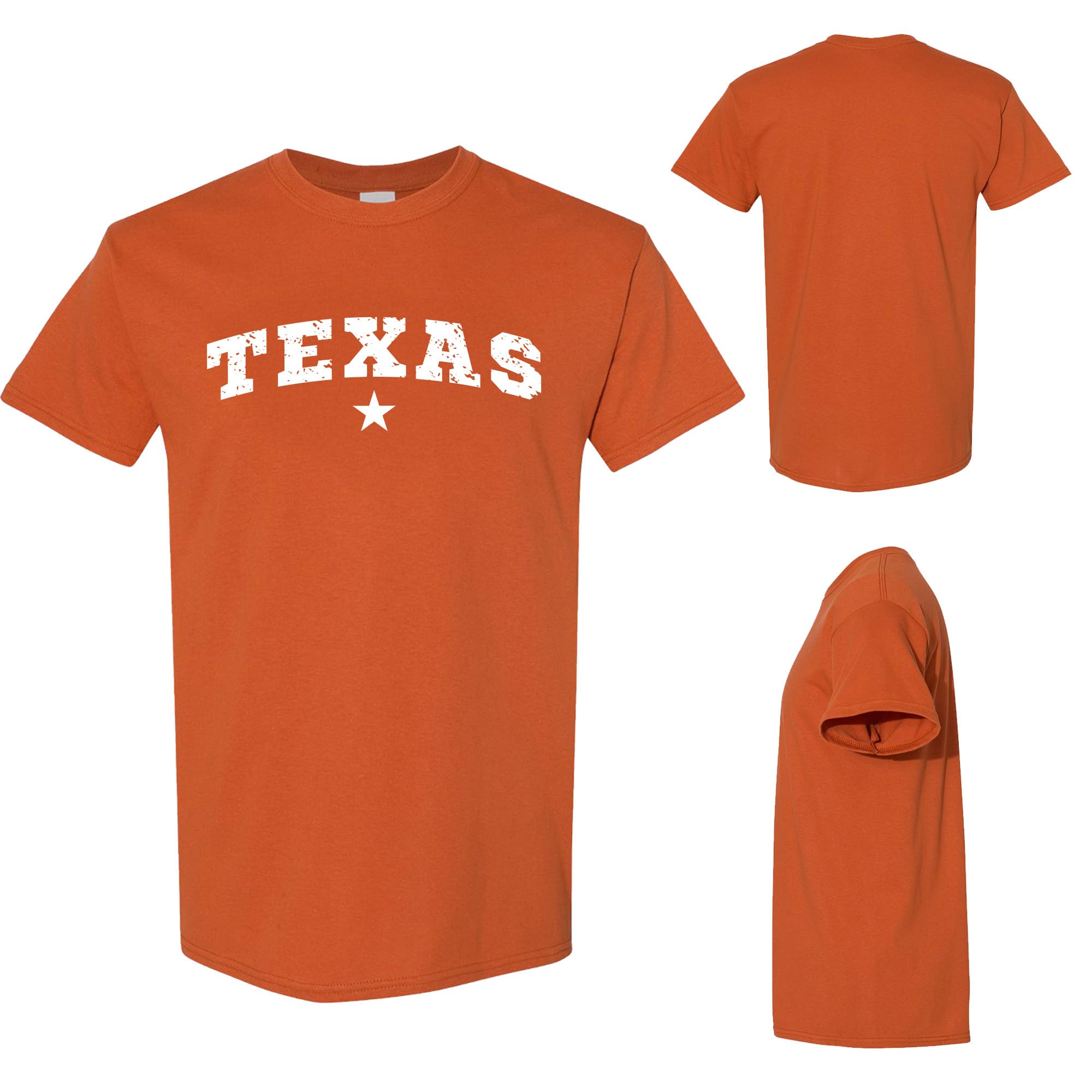 - Timeless Texas Design – This t-shirt features a bold "TEXAS" arch with a distressed look and centered star, making it perfect for proud Texans and fans of western-style fashion.